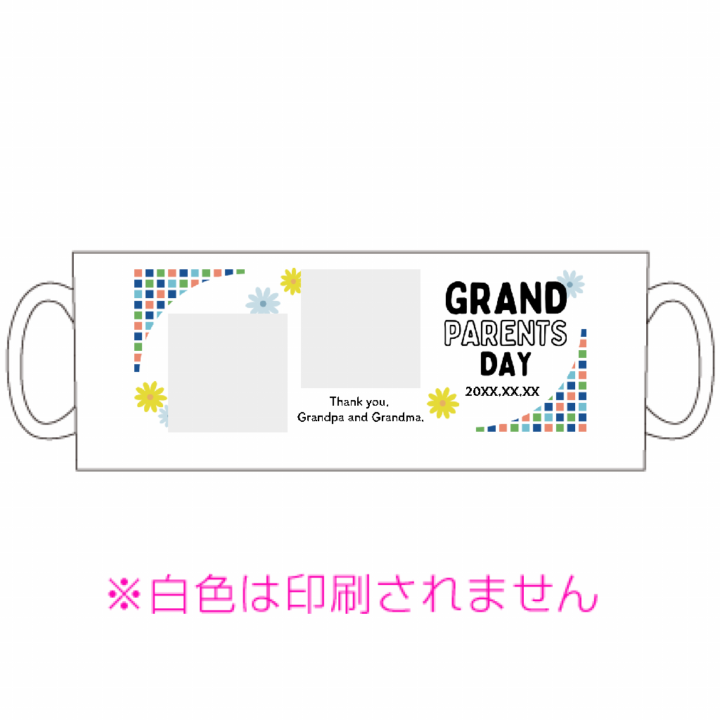 カラフルなコーナーフレームがかわいい写真入りマグカップをオリジナルでプリント 敬老の日のテンプレート