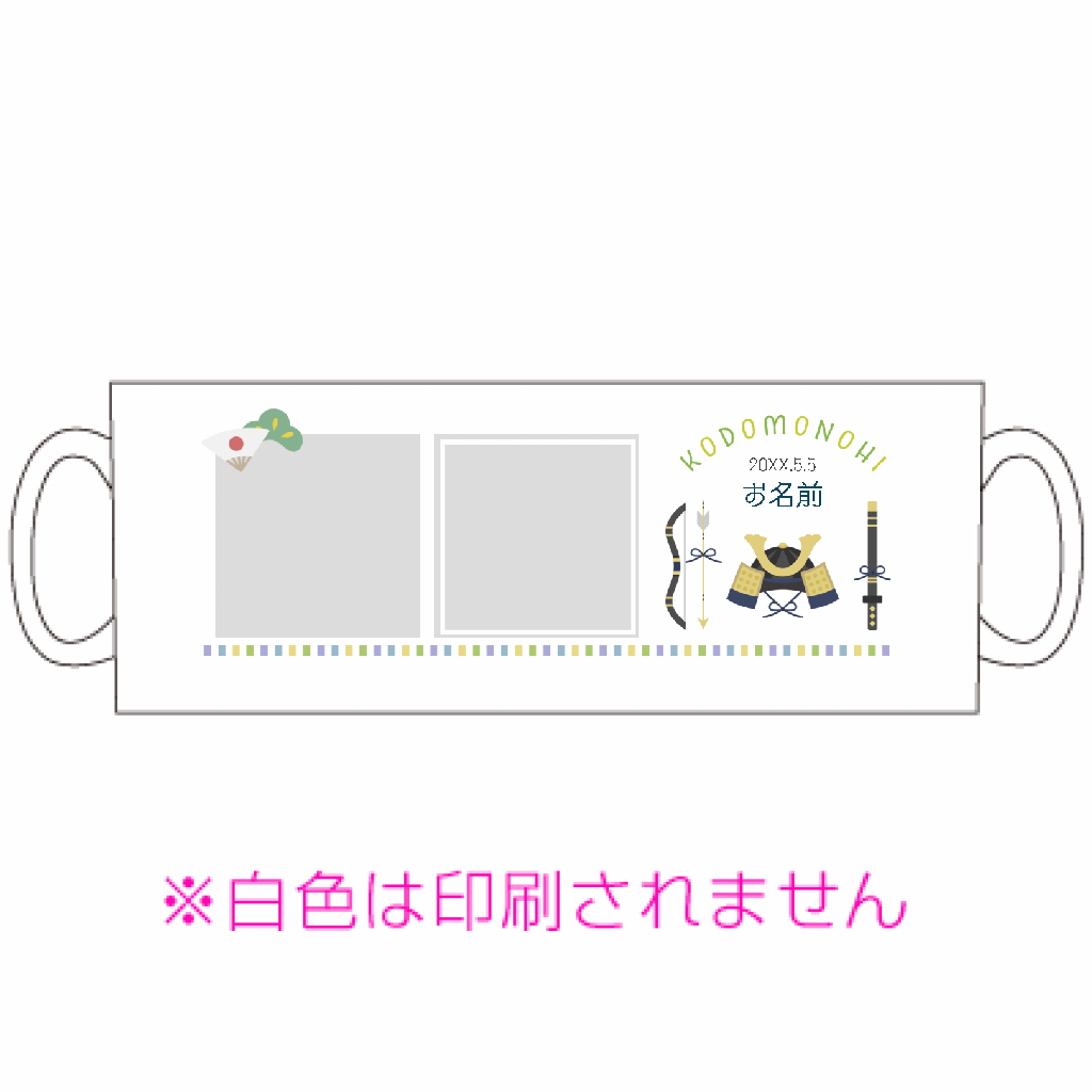 写真や名前を入れられる、兜や弓矢のイラストが入ったデザインテンプレートで、端午の節句(こどもの日)のマグカップをオリジナルプリントできます。記念品やプレゼントにおすすめです。
