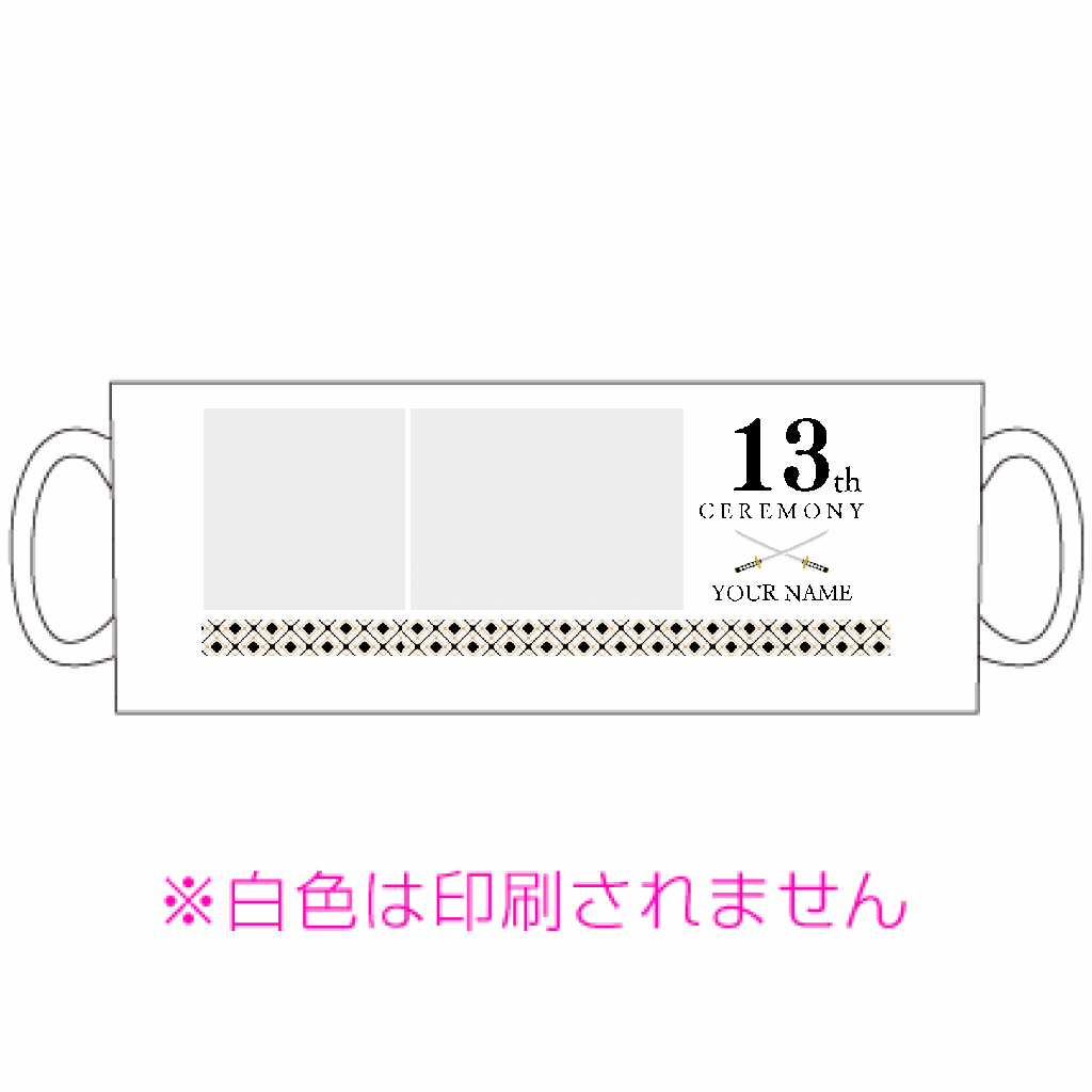 刀のイラストとメッセージ入り十三参りの写真マグカップをオリジナルでプリント 十三参りのテンプレート
