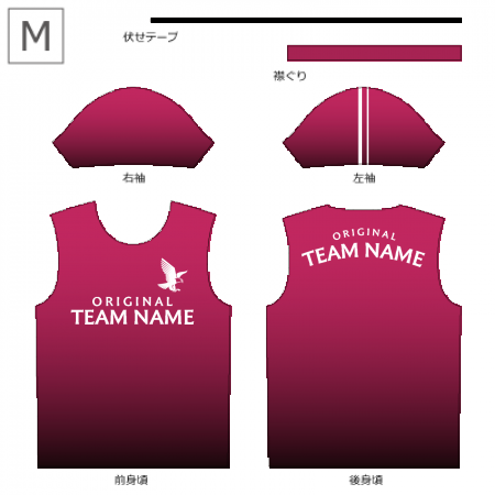 チーム名や名前、背番号を入れられる、ピンクと黒グラデーションが入ったデザインテンプレートで、お揃いのチームTシャツをオリジナルプリントできます。サッカーチームやフットサルサークル、部活などのユニフォーム作成におすすめです。